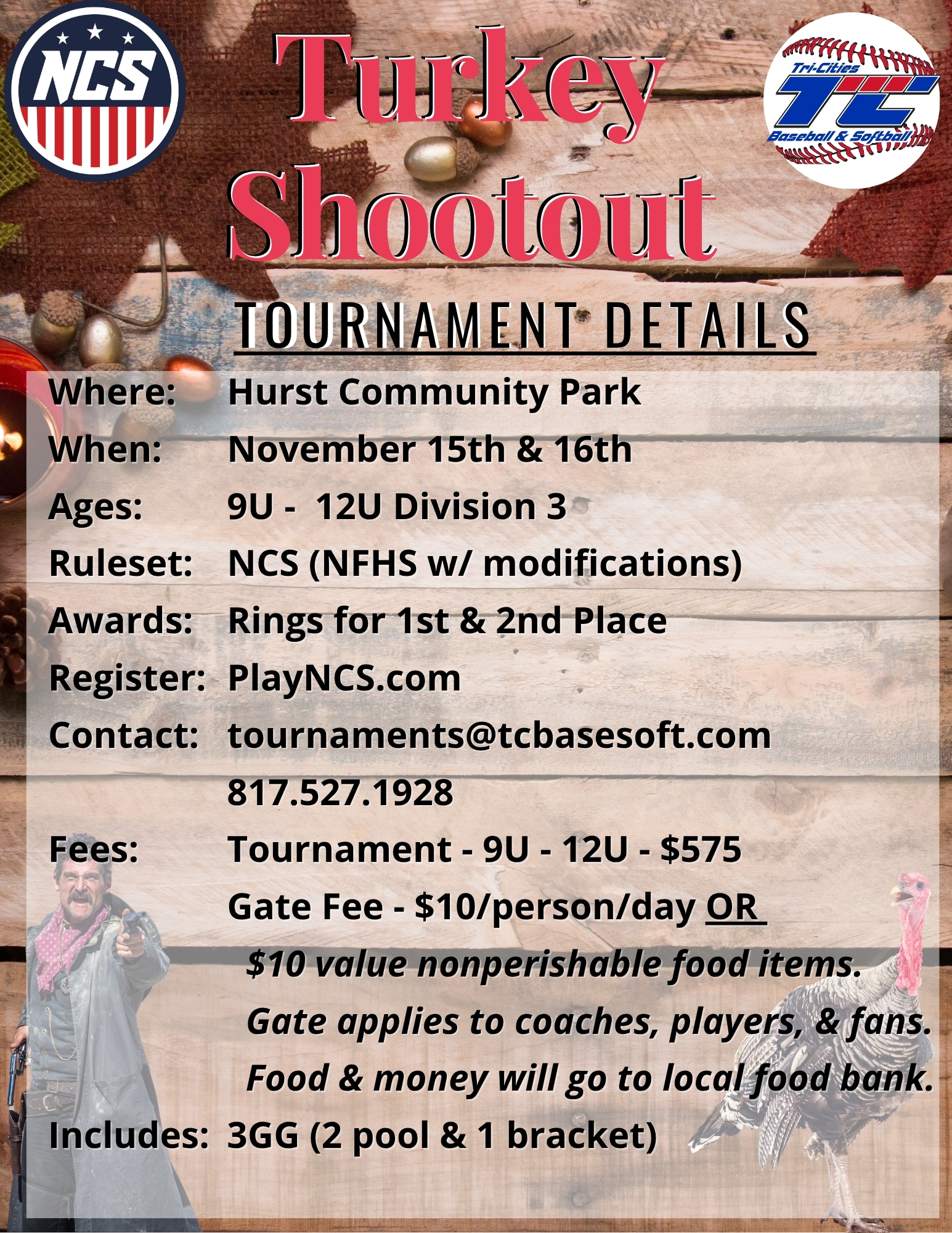 Team gate fee: No team gate fees for TCBSA hosted events in Fall 2025