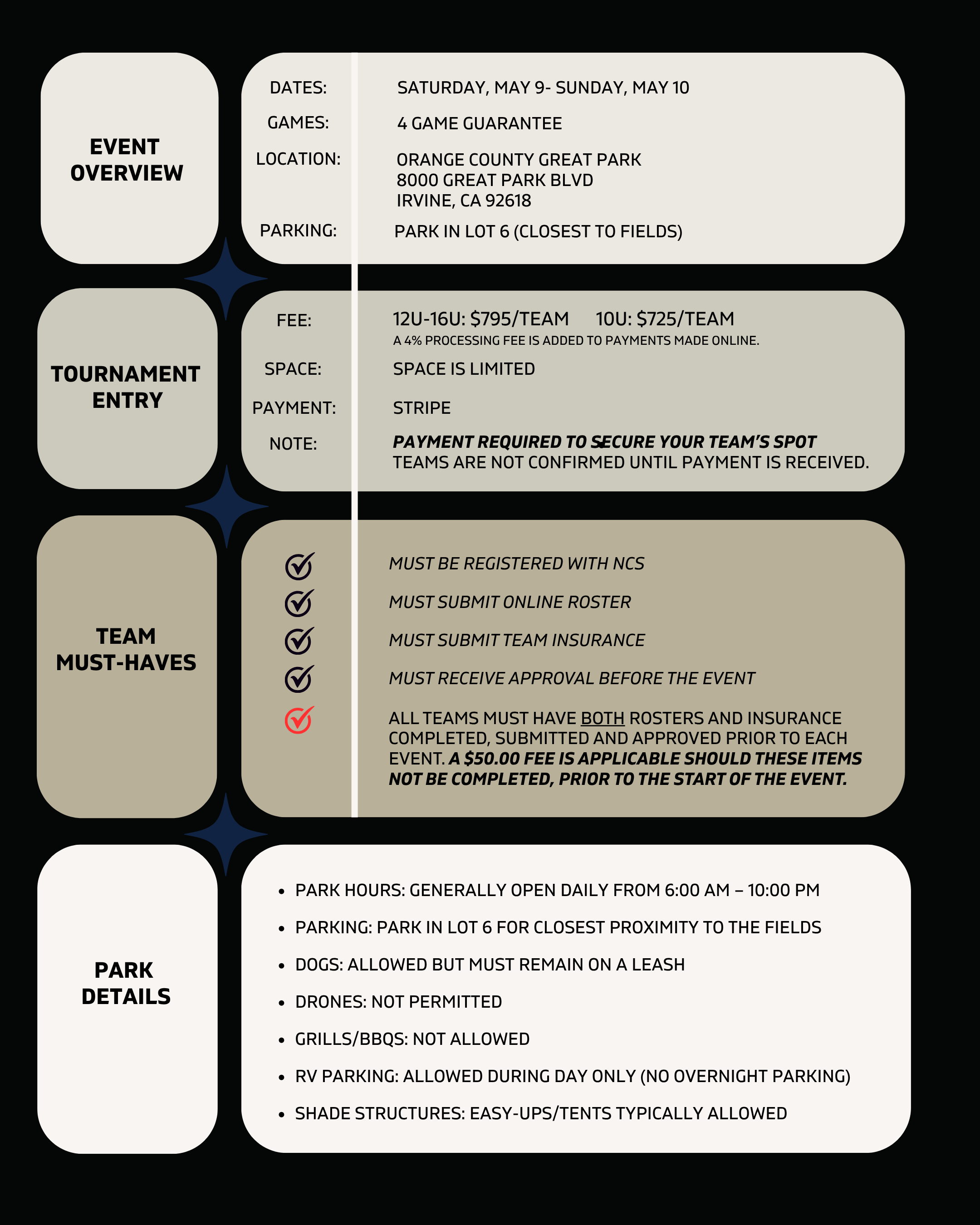 4GG- 3 Pool Play + Single Elimination. Organized Event. Premium Location.