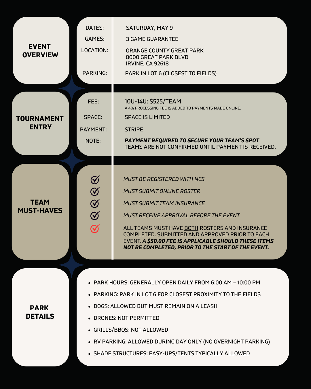 4GG- 3 Pool Play + Single Elimination. Organized Event. Premium Location.