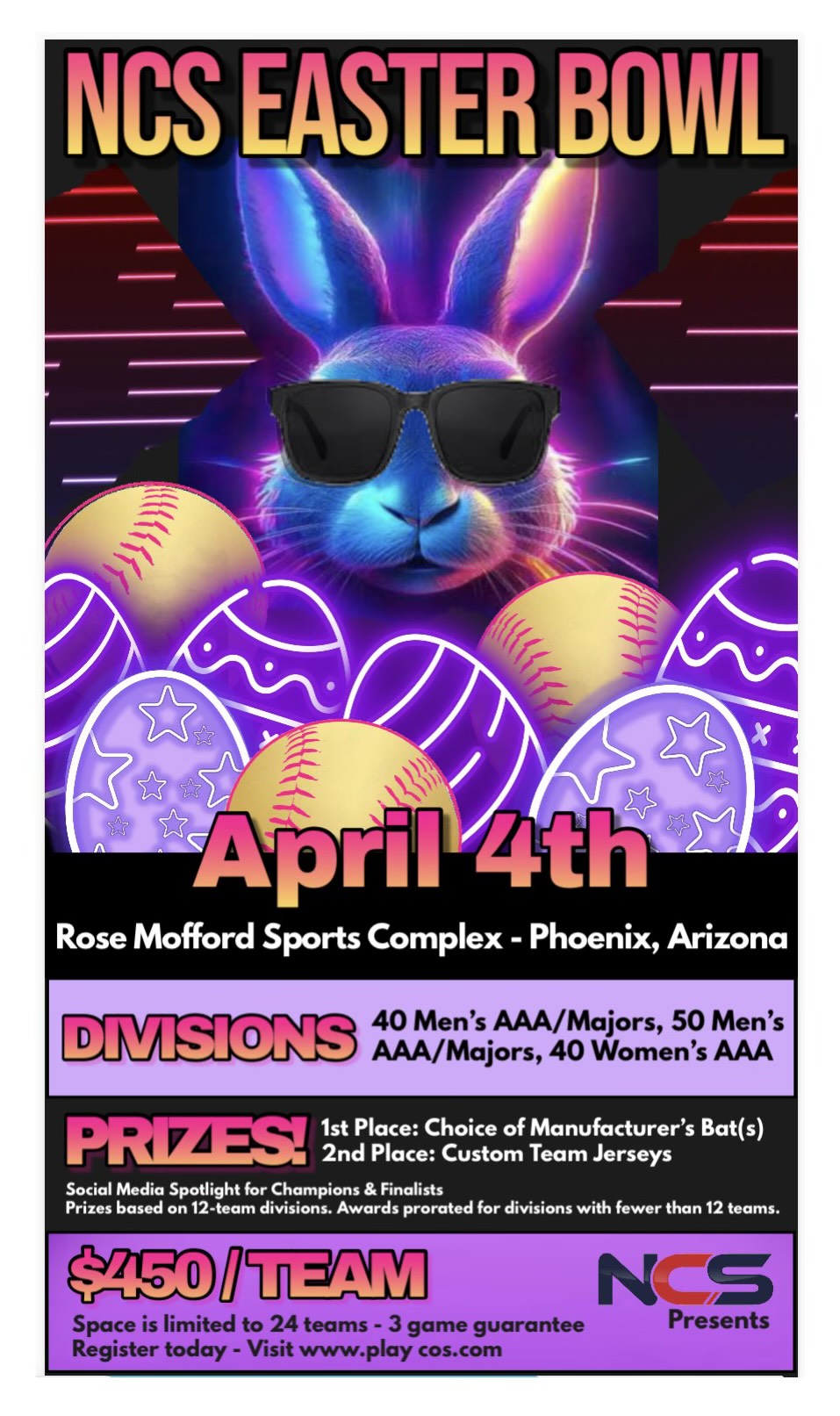 Compete in the 2025 NCS Seniors Easter Bowl at Rose Mofford Sports Complex in Phoenix, Arizona. One-day senior softball tournament featuring top competition, certified umpires, and championship awards. Register before March 26, 2025!
