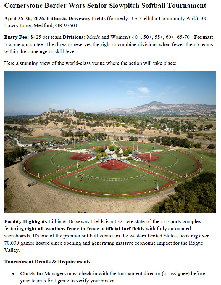 Lithia & Driveway Fields is a 132-acre state-of-the-art sports park, features eight all-weather, fence-to-fence artificial turf fields with fully automated scoreboard and lighting systems. It’s one of the premiere softball venues in the western United States! While you’re here, take an extra few days to enjoy all the Rogue Valley has to offer, including world class theater and music at the Oregon Shakespeare Festival and the Britt Festival, local breweries and wineries, jet boats and rafting on the Rogue River, or a day trip to Crater Lake National Park. Snack bar, operated by Aloha Grill, will be open during the tournament