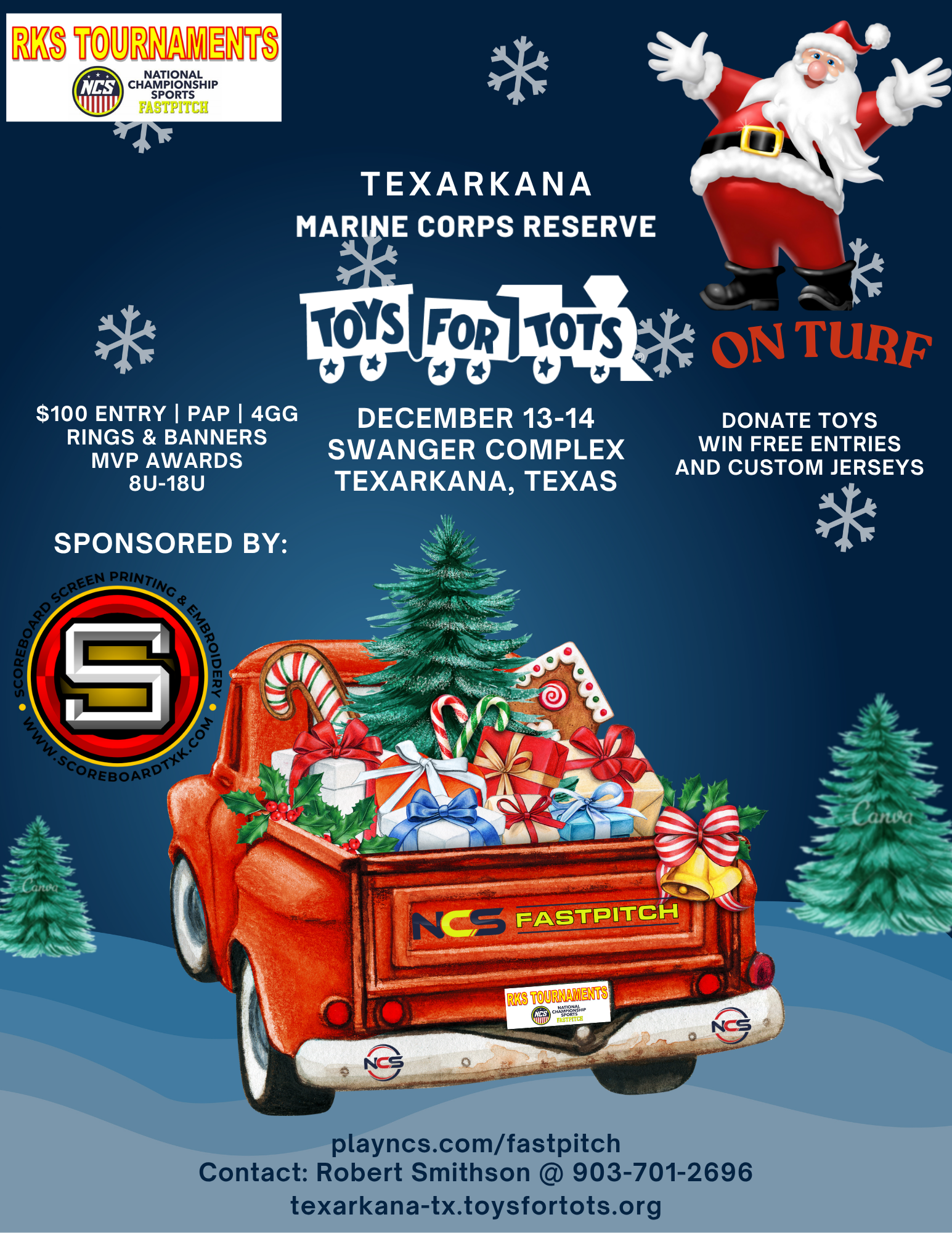 Each player and coach should bring (1) new, unwrapped toy on Saturday. Larger items such as bicycles or electric riding toys will count as a team toy. The team that brings the most toys will win FREE ENTRY for ALL remaining RKS Tournaments in the 2026 season and up to (12) customized sublimated jerseys brought to you by RKS Tournaments & Scoreboard Screenprinting & Embroidery. Fans are also encouraged to bring toys which will count toward the team of their choice. Santa Claus will be at the park on Saturday to take pictures. Come out and enjoy a great weekend at the ballpark and donate some toys to the Texarkana community!